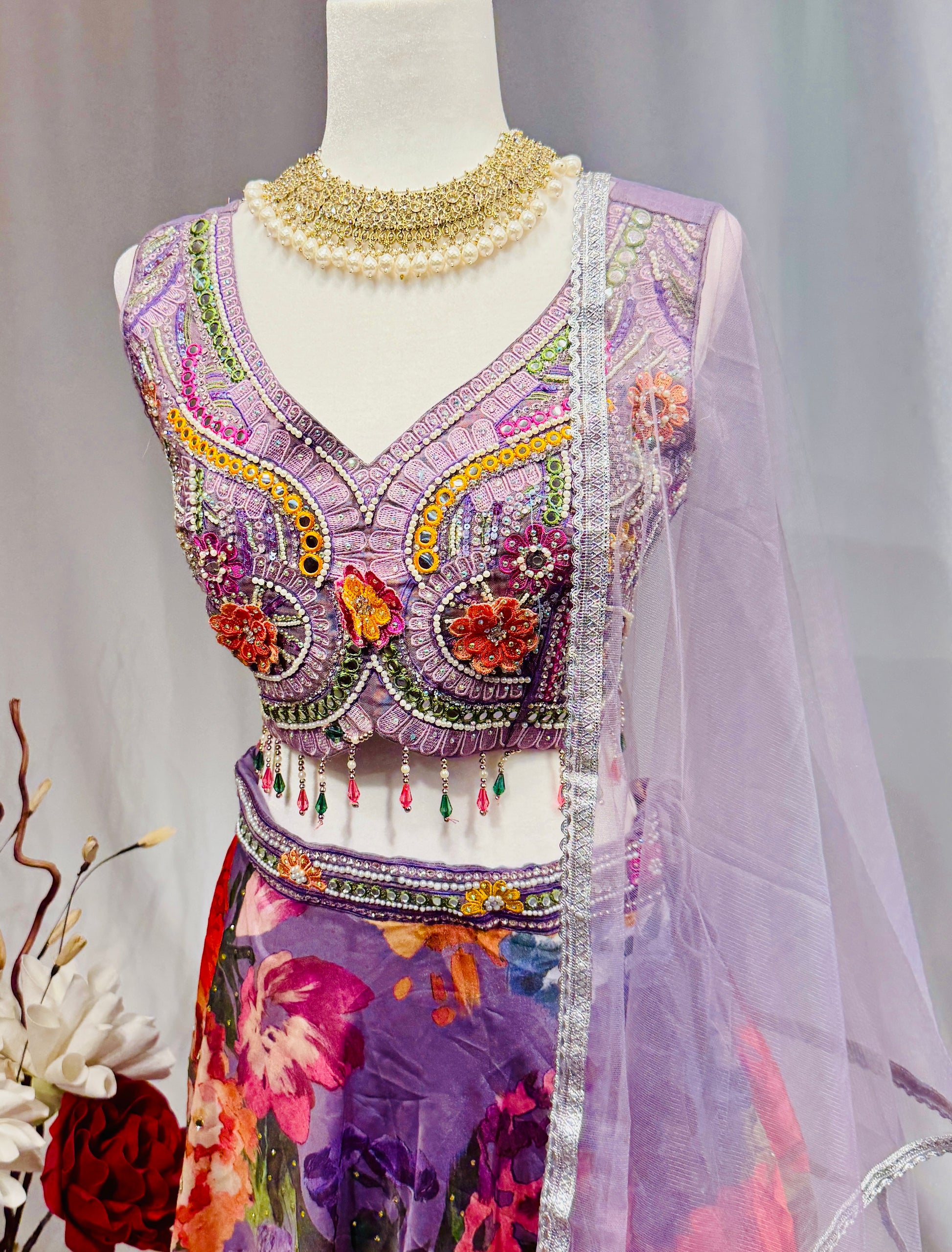 Step into a world of elegance with this Lilac organza multi-colored botanical floral lehenga. Paired with an intricate hand embroidered blouse and a coordinated plain net dupatta.