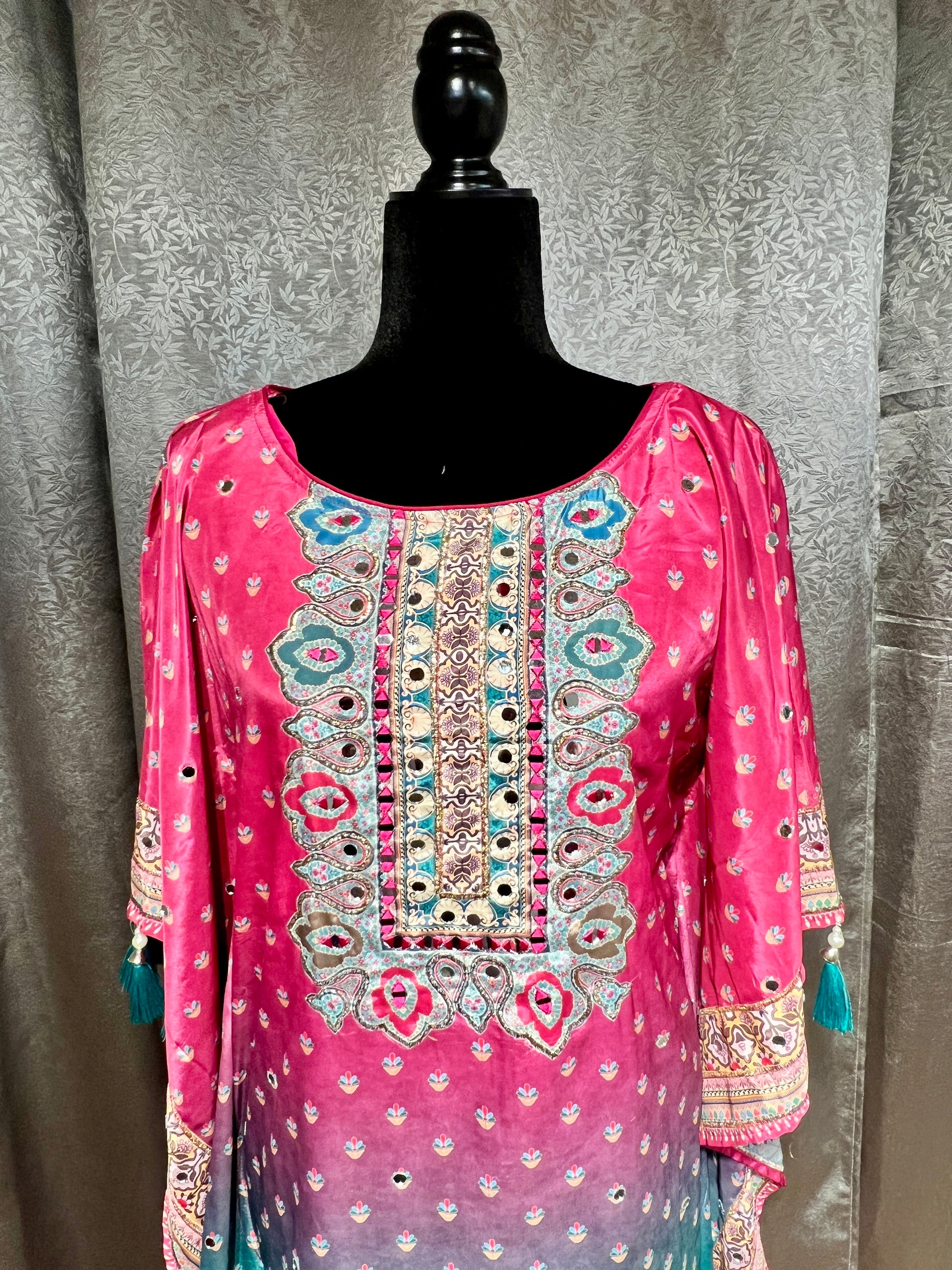 Celebrate in style with this vibrant Rani Pink Embellished Crepe Silk Kaftan Set, perfect for festive gatherings, and parties. The kaftan kurta features an exquisite blend of printed embellishments, delicately adorned with sequins, beads, stones, and traditional hand embroidery.