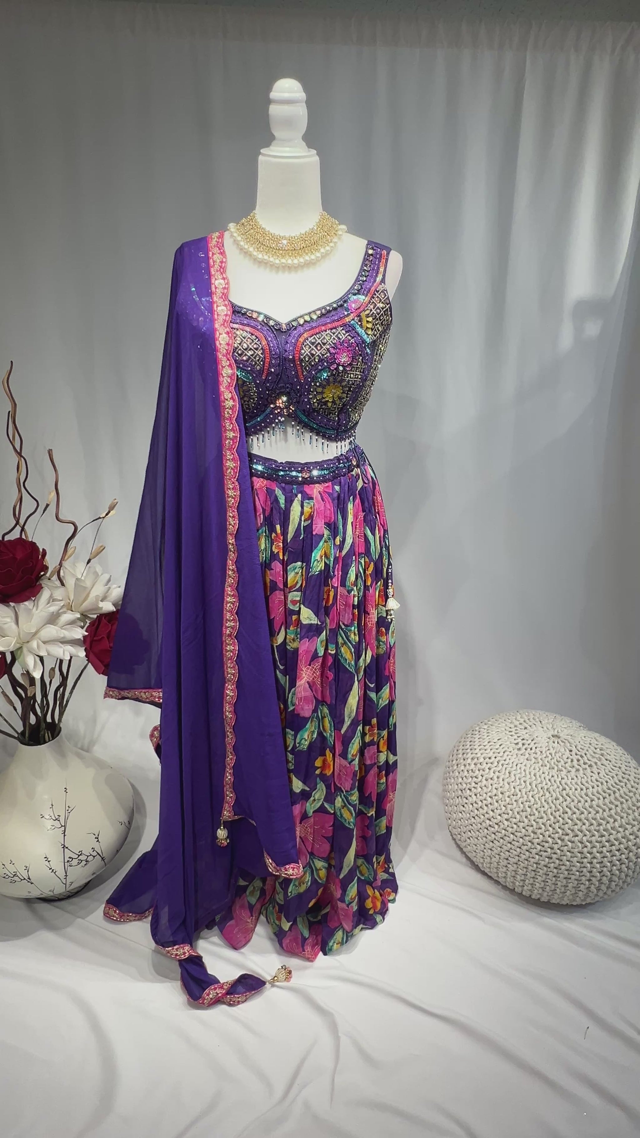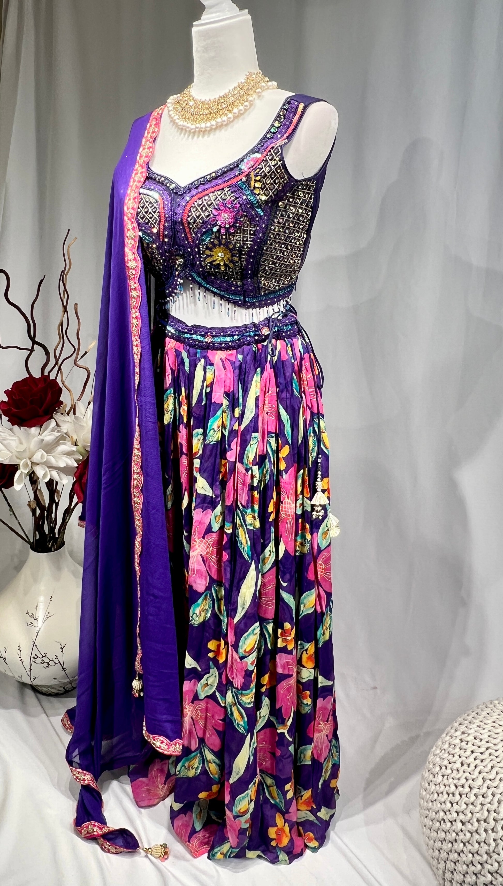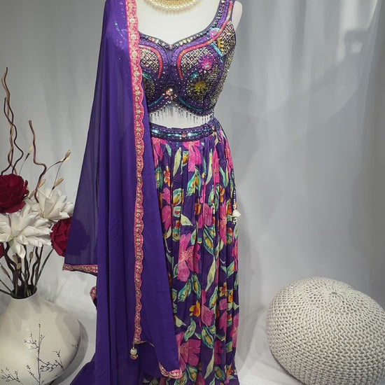 Radiate festive charm in our tropical Printed Lehenga Set with beautiful Embroidered Blouse. The flowing organza satin lehenga features bold prints and hand-done mirror work on the waistline, adding a subtle shimmer to every step. Comes with cape and dupatta - choose your style.
