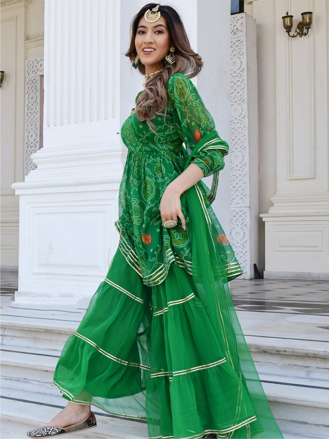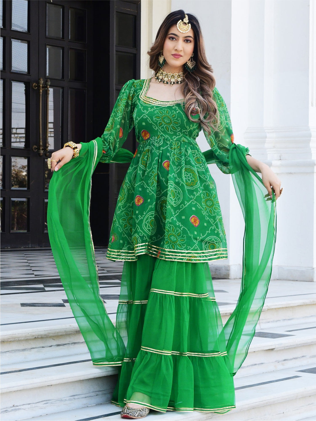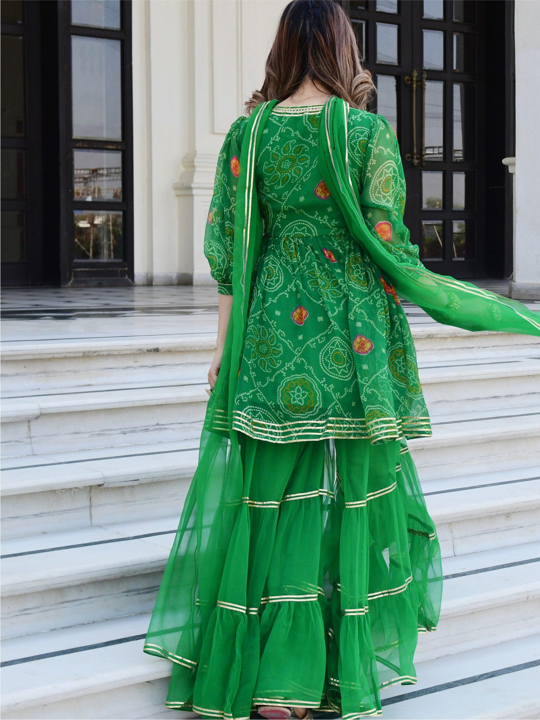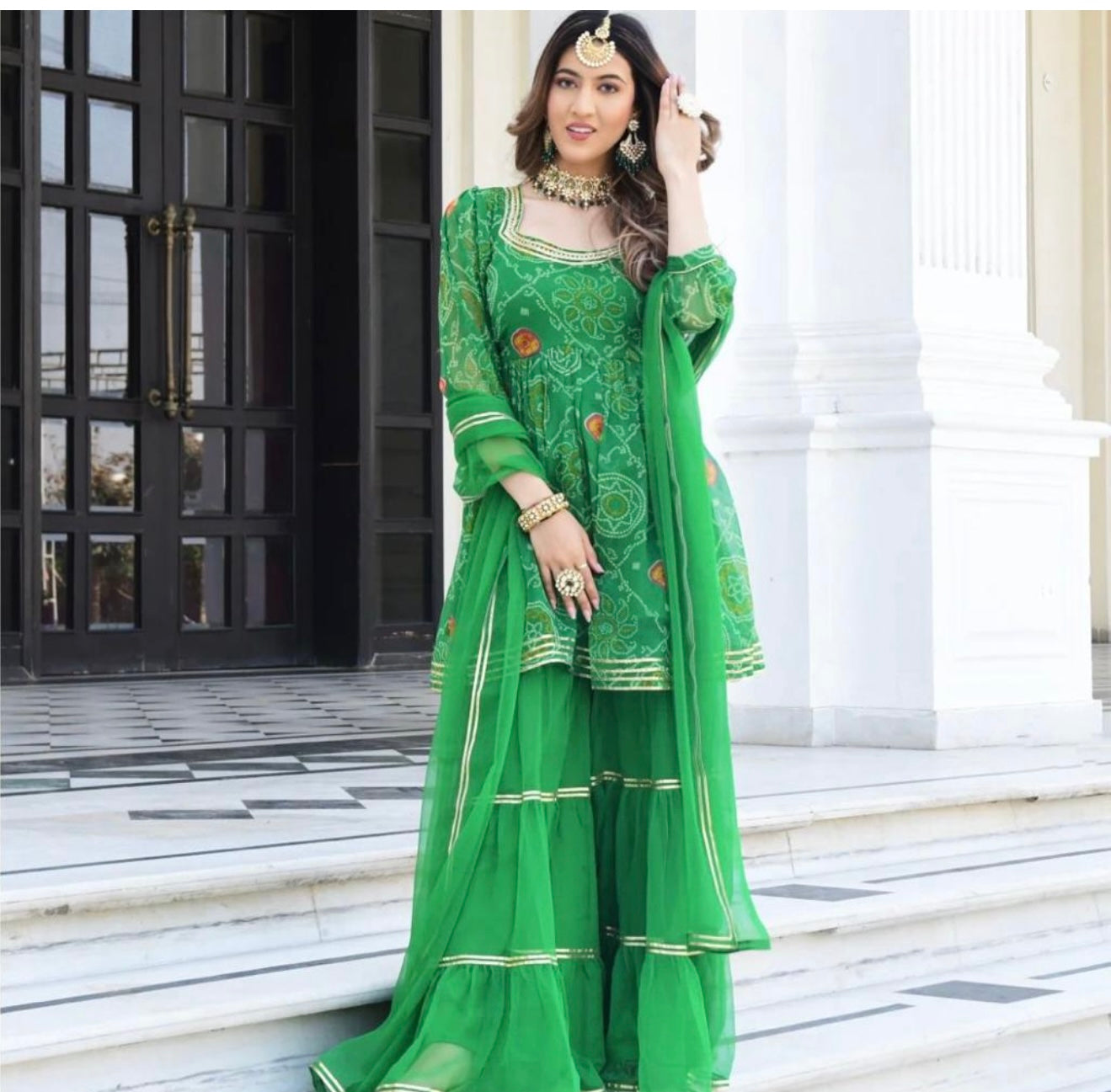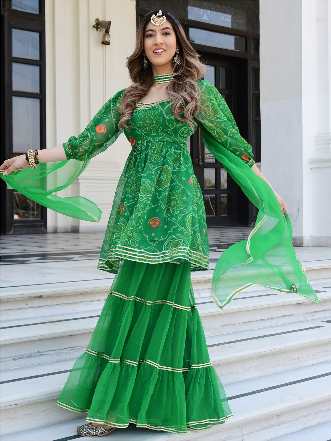 Elevate your style with our Green Bandhani Print Kurta and Sharara Set – a perfect blend of tradition and trend. This vibrant ensemble features intricate bandhani patterns that add a touch of elegance, while the refreshing green hue exudes sophistication