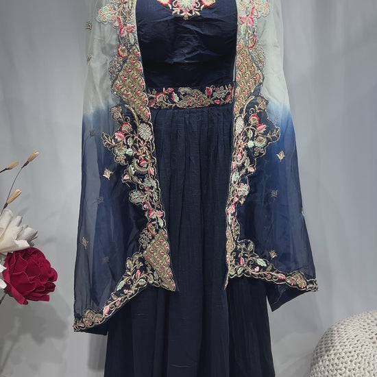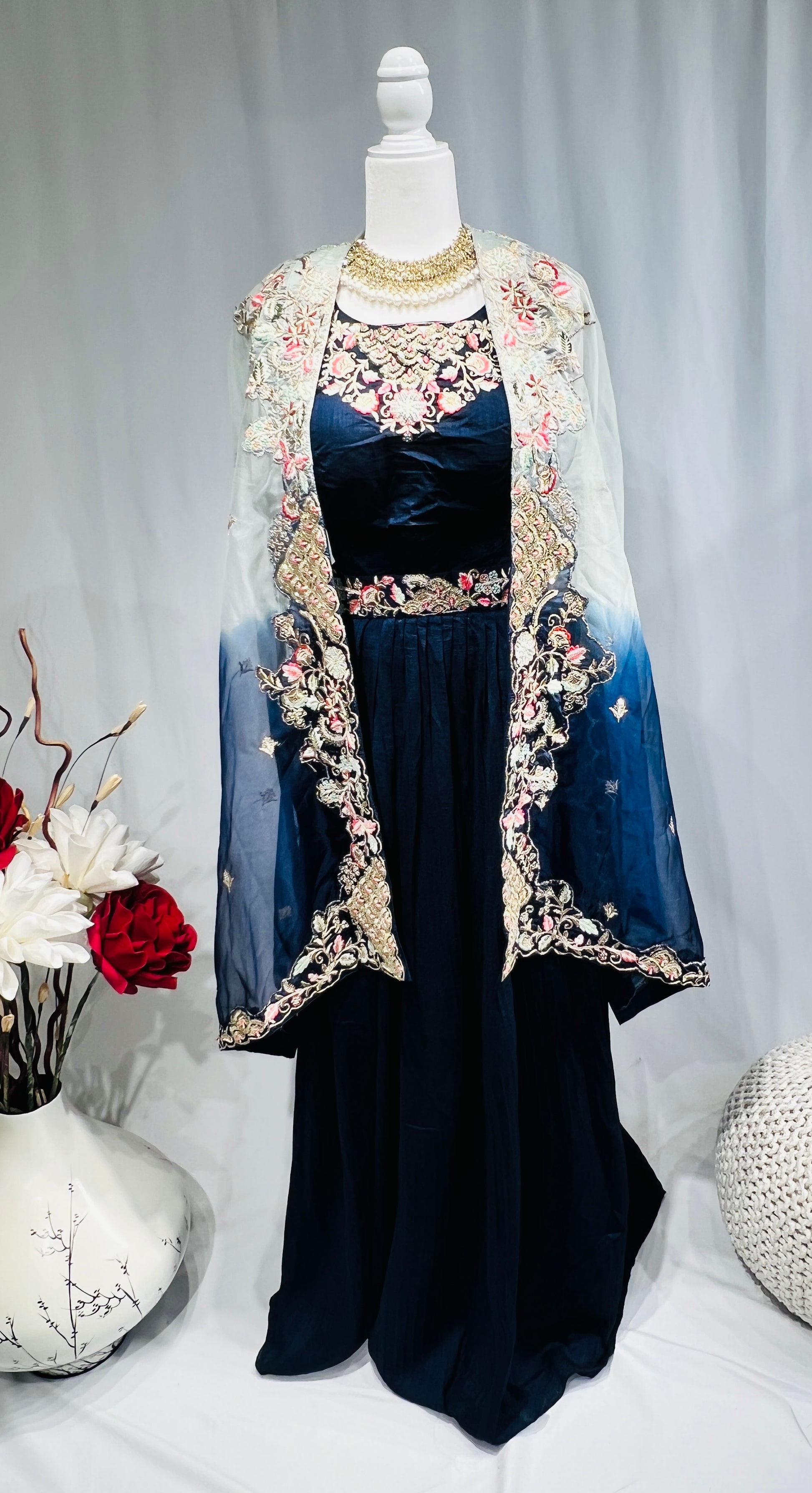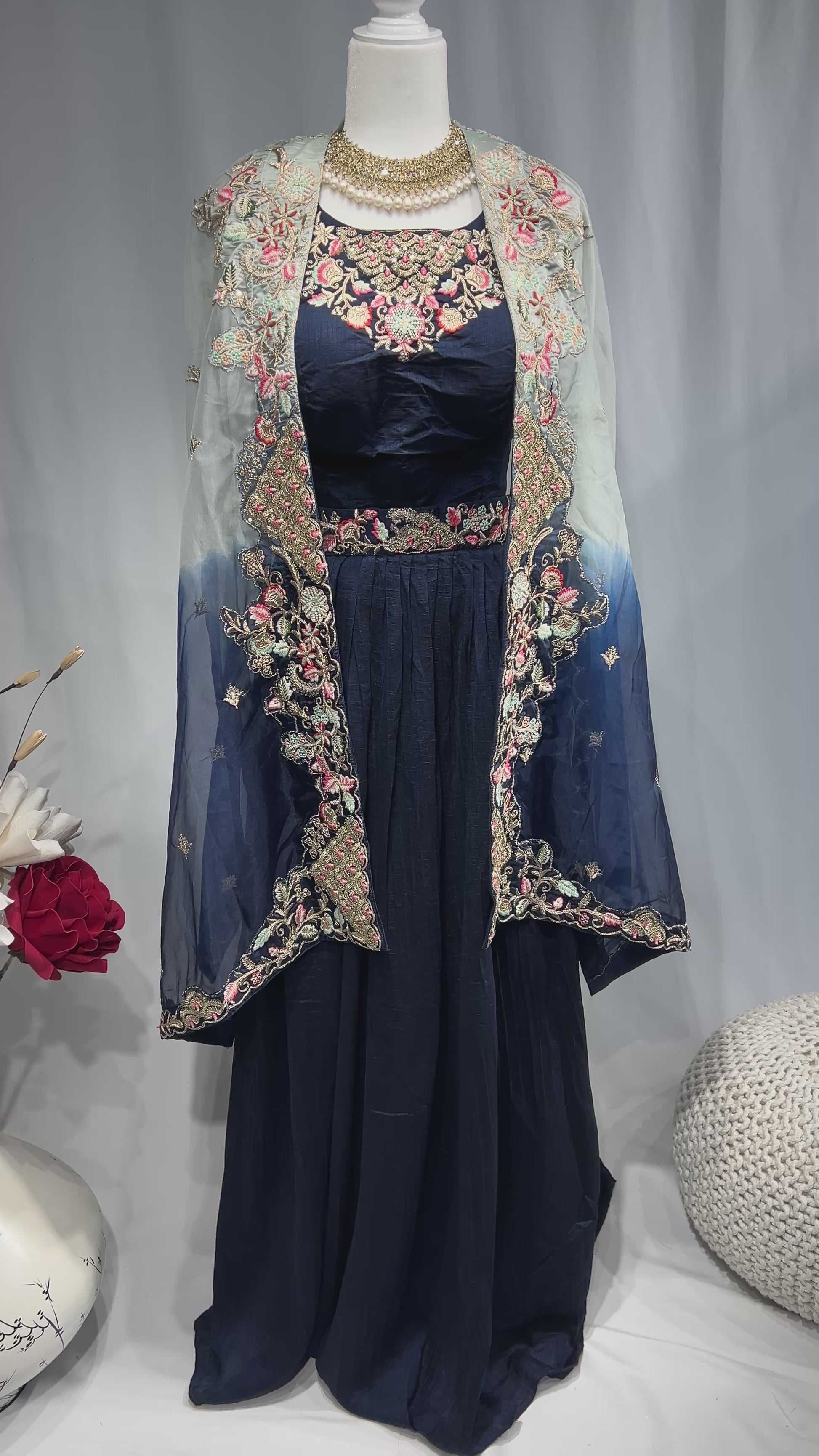 Charming Navy Blue plain Lehenga featuring thread & moti hand embroidered belt. Paired with a floral, paisley motif embroidered blouse and an embroidered scallop hem cape/jacket.